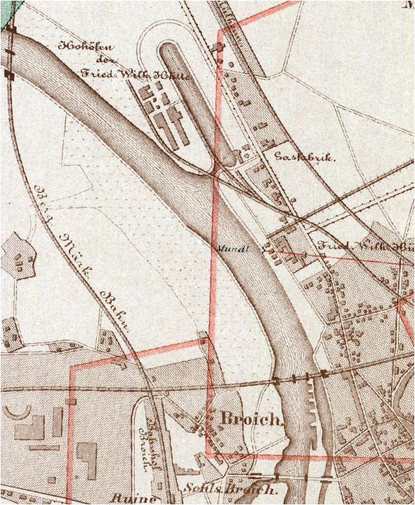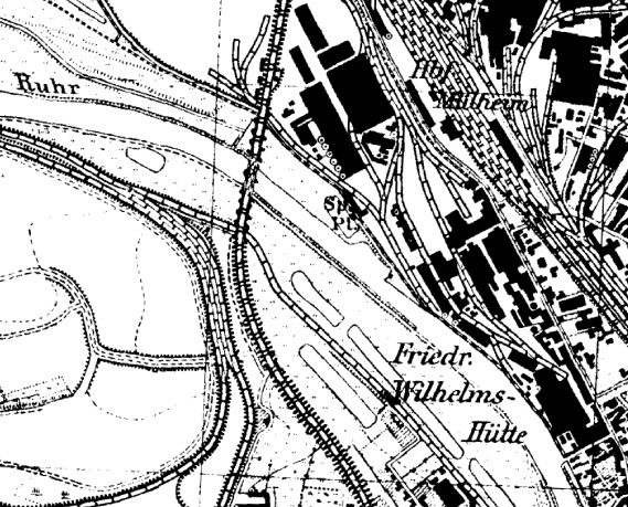 Mechanische Werkstatt, Maschinenfabrik, vor 1841/1853 5a Über mehr als ein Jahrhundert hinweg war seit ihrer Gründung 1811 die Herstellung von Maschinen ein zentraler Produktionsbereich für die Friedrich Wilhelms-Hütte. Wo die erste Maschinenwerkstatt von Johann Dinnendahl genau stand und wie das Gebäude aussah läßt sich leider mittels alter Karten und Darstellungen nicht mehr nachvollziehen.