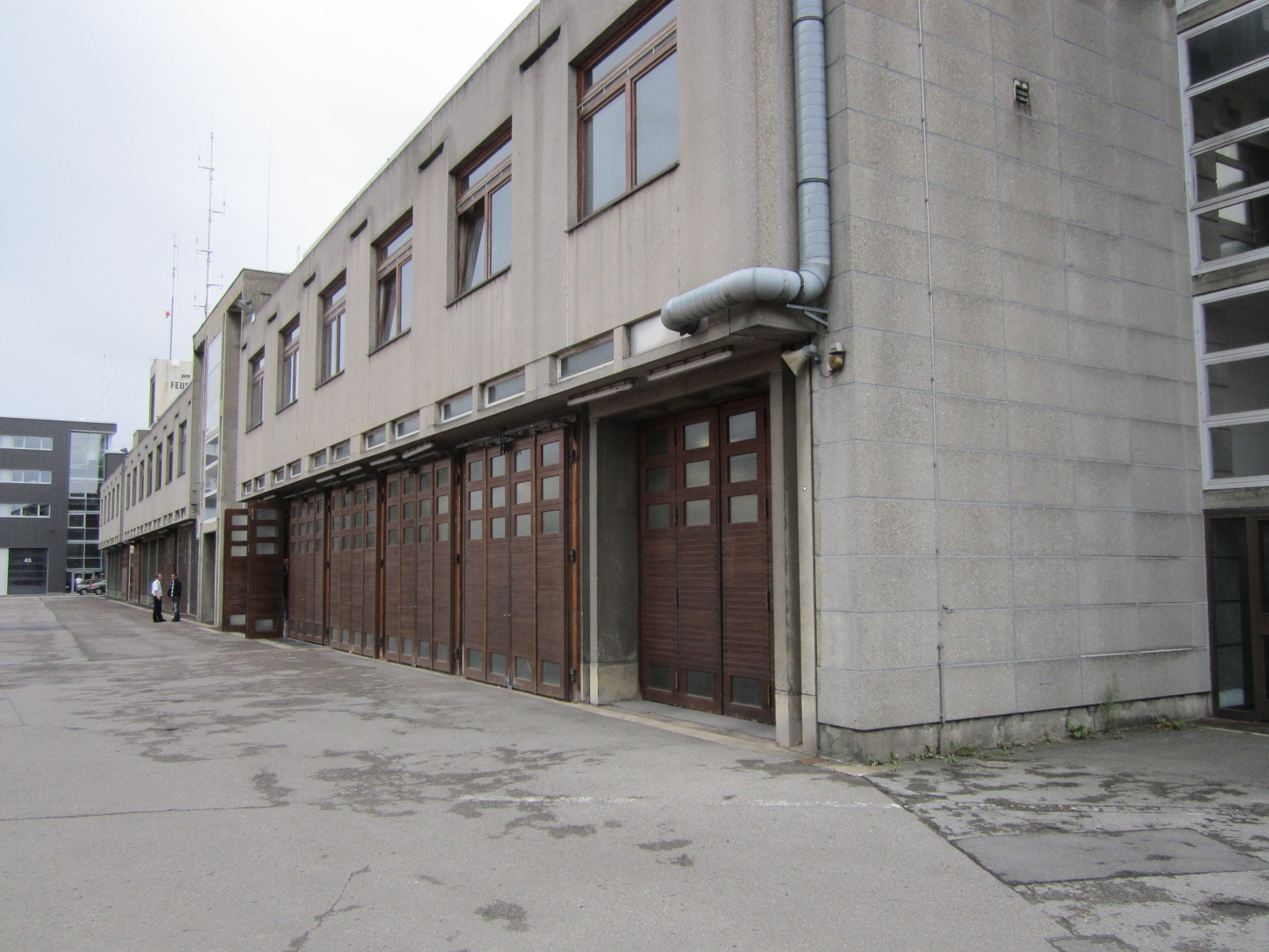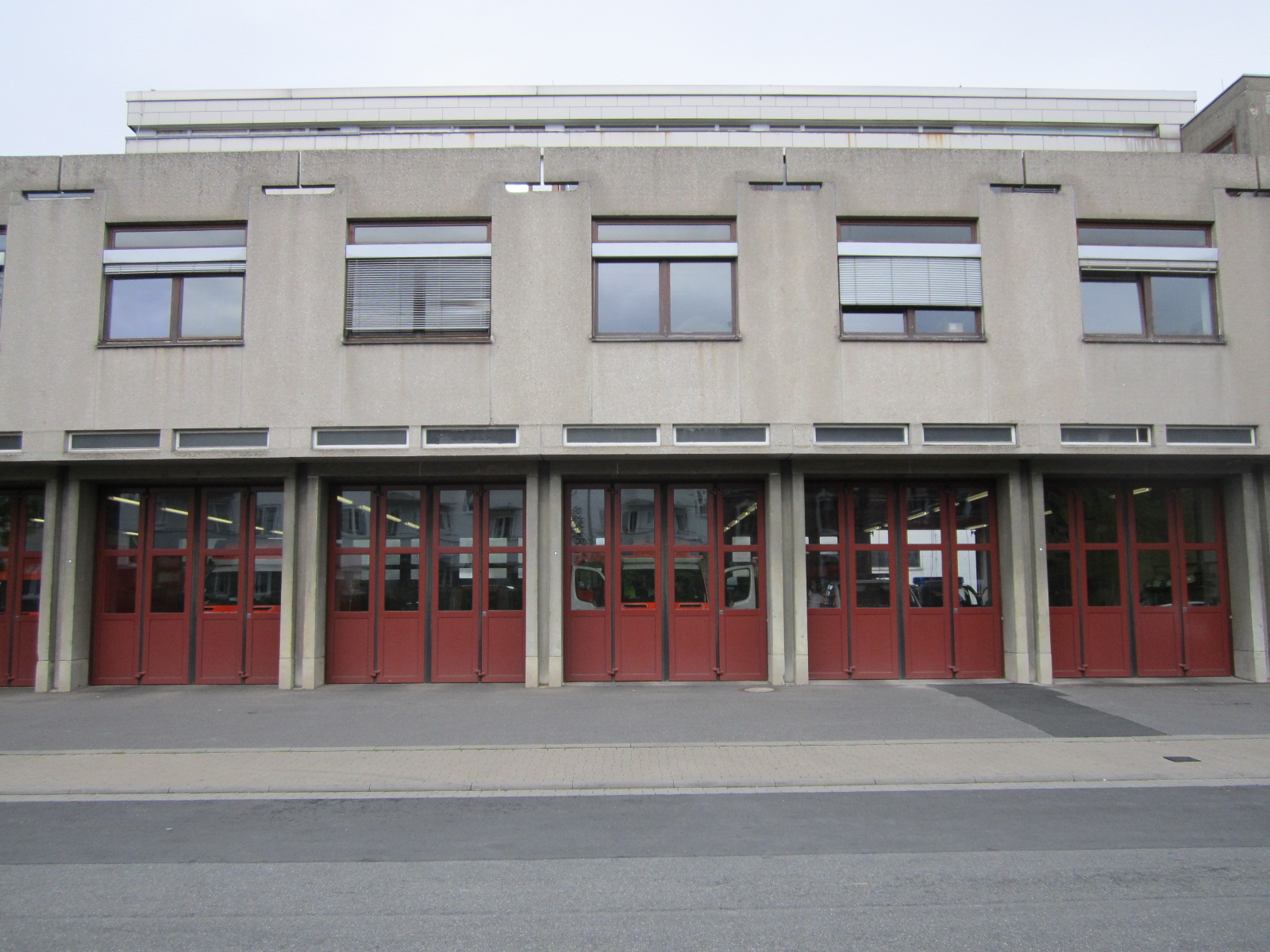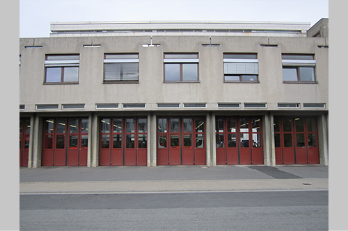 Der dreigeschossige Hauptbau ist deutlich geschoßweise in drei Zonen gegliedert mit den, gegenüber dem Obergeschoß zurückspringenden Erd- und Obergeschoß. Im Erdgeschoß dominiert das Wechselspiel zwischen den im Querschnitt H-förmig gestalteten Stahlbetonpfeilern und den Faltschiebetoren. Die Schiebetore zur Straße sind so an die Hinterkanten der Pfeiler montiert, dass die Pfeiler als stark strukturierende Elemente im Erdgeschoß in Erscheinung treten. Die Tore zur Straße sind erneuert, während die rückwärtigen Tore zum Hof teilweise erhalten sind. Einige Tore wurden in die vordere Flucht der Pfeiler versetzt. Über dem Erdgeschoß ist das vorspringende Obergeschoß für die Mannschaftsräume durch großflächige Rechteckfenster gegliedert. Das Dachgeschoß ist zurückliegend als eine Art Staffelgeschoß in den Hintergrund gerückt und wird zudem durch die Brüstungselemente vor den Gängen und begehbaren Flächen abgeschirmt. Das Dachgeschoß ist in leichter Stahl-/Holzkonstruktion ausgeführt mit einer Verkleidung aus Siporex-Platten.