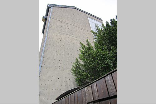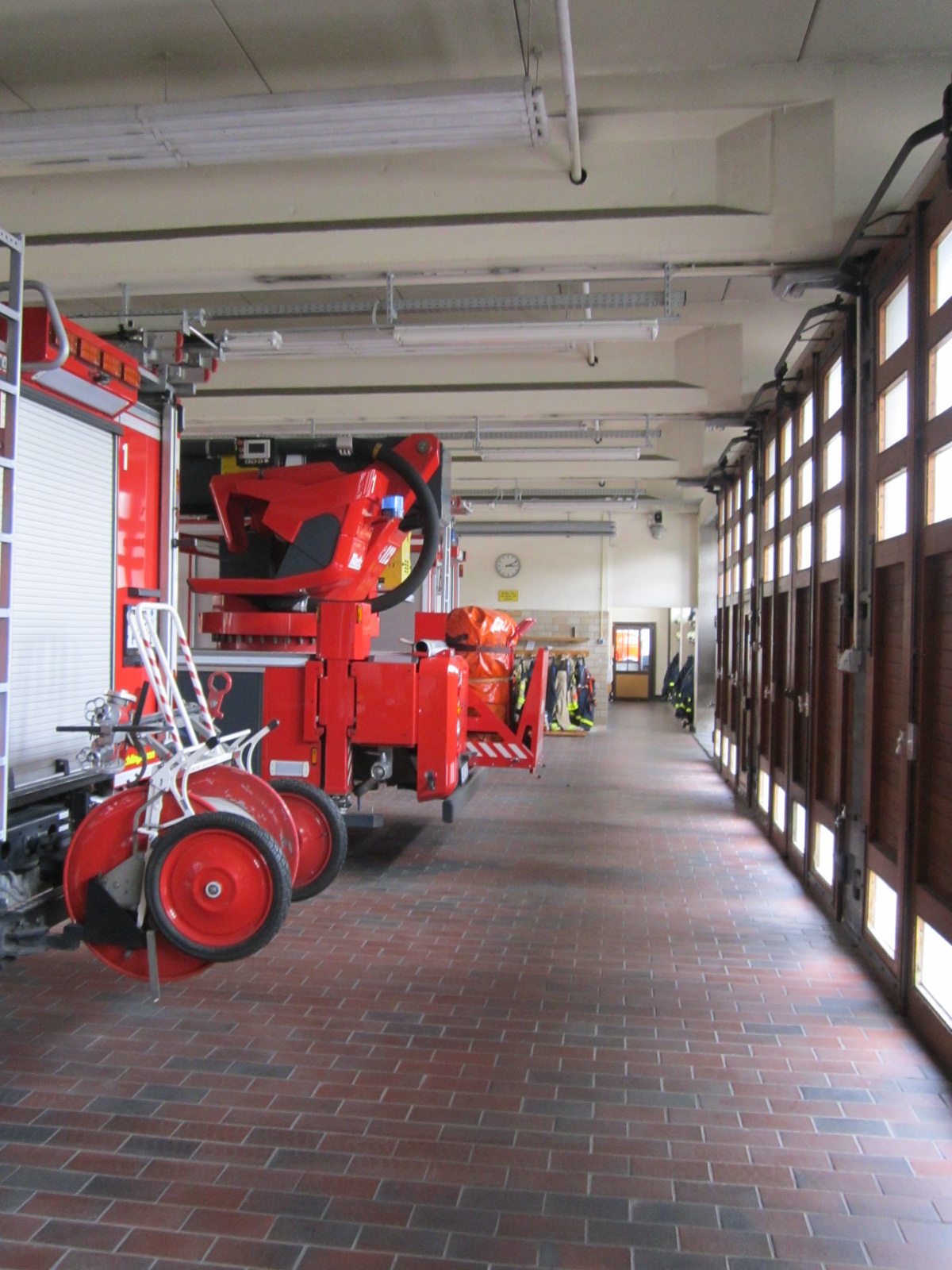 Auch der Schlauchturm wurde als kubisches Bauwerk mit ungegliederten Außenwänden auf drei Seiten und Flachdach ausgebildet. Zum Hof ist der Turm geschoßweise unterteilt mit Brüstungselementen und einer größeren geschlossenen Fläche im oberen Turmteil aus Holz. Die Schlauchtrocknung erfolgte im Inneren durch einen Schacht mit umlaufenden Treppen.