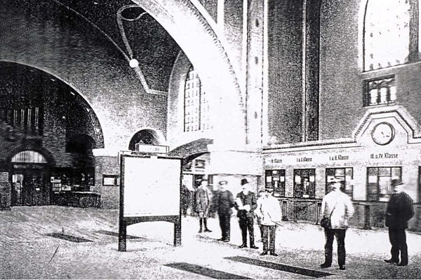 Von der Eingangshalle zu den Wartesälen gelangte man durch einen heraldisch geschmückten Bogen mit dem Leitspruch des Architekten: „Am Anfang war der Zweck“. Zum Vorplatz hin lag der Wartesaal der I. und II. Klasse an dessen Wänden Tapeten mit grau-blauem Muster hingen. Die Decke, Türen und einige Wandnischen waren aus braunem Holz gearbeitet worden und in der Mitte stand ein Laufbrunnen mit grünen Fliesen und einer schwarzer Marmorsäule. Der Wartesaal III. Klasse lag auf der rückwärtigen Seite und war weniger reich ausgestaltet. Es gab allerdings eine braun-rot bemalte Kassettendecke und ebenfalls mit Holz gearbeitet Nischen. Hinter den Wartesälen lag die Küche und Anrichte, im oberen Geschoss befanden sich die Personalräume und Unterkünfte für den Wirtschaftsbereich, sowie für das Bahnpersonal. Außerdem noch die Büros für den Bahnhofsvorsteher und die Fahrleiter. Vor den Sperren am Anfang des Personentunnels gab es einen kleinen Laden für den Bedarf der Reisenden, dem Laden gegenüber befanden sich die Toilettenanlagen.
