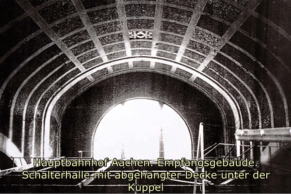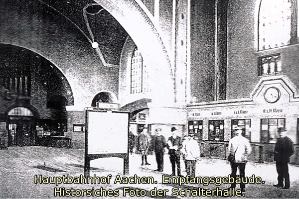 Im Inneren der großen Eingangshalle lagen direkt gegenüber den Eingangstüren die in Marmor ausgeführten Fahrkartenschalter. Auf der rechten Seite befand sich die Gepäckaufgabe. Nach links schloss sich der Personentunnel zu den Gleisen an und man gelangte zu den Warteräumen. Die Wände und die großen gewölbten Deckenkuppeln waren hell, weißgrau verputzt und mit grauen, leicht blauen Bemalungen verziert. Die großen Thermenfenster hatten dekoratives Kathedralglas aus England, das mit einem Flechtmuster besondere Streifen aus Glas erzeugte. Der Hallenbogen fand ihren Abschluss auf kurzen, gedrungenen schwarzen Säulen mit mächtigen, breit ausladenden Kapitellen. Diese Kapitelle waren ebenfalls bildhauerisch bearbeitet und zeigten verschiedene Reliefs. Das erste Kapitell zeigt Darstellungen aus der Geschichte Aachens, wie die Auffindung der Heilquellen und eine Szene mit Karl dem Großen. Das zweite Kapitell war für das Gewerbe der Stadt bestimmt und zeigte die Tuchweber, die Nagelschmiede und ein Symbol für das Bad. Auf dem dritten Kapitell waren die Werkleute abgebildet und auf dem vierten Symbole für den Reiseverkehr.