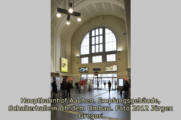 Die Sanierungsmaßnahmen wurden ordentlich, sachgemäß und denkmalgerecht durchgeführt. Positiv war dabei besonders zu sehen, dass die Eingangshalle mit den Säulenkapitellen wieder in ihren ursprünglichen Charakter zurückversetzt wurde und man dabei so schonend wie möglich mit der Bausubstanz umging. Die Arbeiten an der Fassade und dem Dachstuhl waren für den weiteren Erhalt des Denkmals ebenfalls wichtig und positiv zu sehen. Die Wand-, Boden- und Deckenverkleidungen waren leider schon seit den 1970er Jahren nicht mehr erhalten, so dass der ursprüngliche Charakter des Aachener Hauptbahnhofs nicht mehr gegeben war. Negativ muss man auch die Ladeneinbauten und die Lage des Reisezentrums sehen, da die Raumaufteilung der Wartesäle somit völlig verändert wurde.