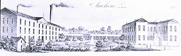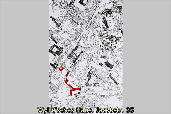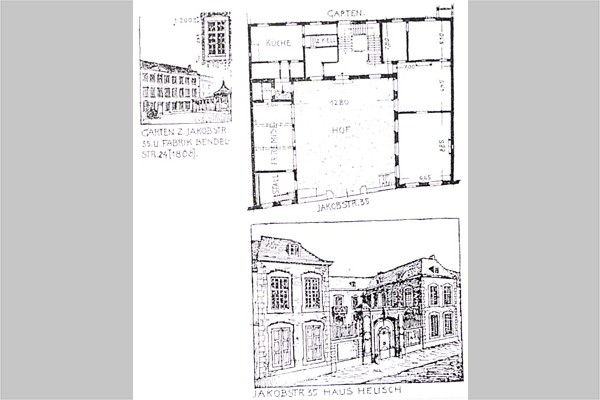 Jacobstraße 35. Der Grundriß zeigt die drei Flügel des Hauses. Durch den linken Seitenflügel des Vorderhauses wurde das Wasser des Paubaches geleitet. Die Gesamtanlage einschließlich Garten ist industriegeschichtlich als Fabrikantenwohnsitz bedeutend. Zugleich ist es möglich, daß im linken Seitenflügel des Vorderhauses zumindest bis zum Bau des Achterhauses auch produktive Funktionen untergebracht waren. Durch den Paubach hatte das Haus Wasseranschluß: das Wasser des Baches wurde durch eine Rinne unter den Seitenflügel und mittels Kanal durch den Ehrenhof und unter den Hauptflügel hindurch in den Garten geleitet.