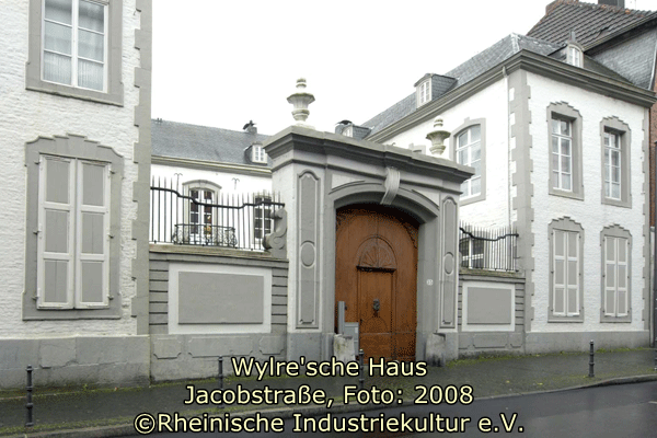 Jacobstraße 35. Dreiflügelanlage nach Art des hôtel de ville. Das erhaltene Vorderhaus ist eine Dreiflügelanlage nach Art des im Paris des 17. Jhs. entwickelten städtischen Adelswohnsitzes, des Stadthôtels (vgl. in Eupen Palais Grand Ry). Der zweigeschossige Baukörper ist mit einem vergleichsweise flachen Walmdach gedeckt. Die Backsteinfassaden sind weiß geschlämmt. Die Fassaden im Ehrenhof haben stichbogige Fenster mit Blausteinumrahmung und Keilstein. Die Mittelachse des Hauptflügels ist betont durch die zweiflüglige Haupteingangstür mit darüber liegendem Balkon auf übereckgestellten Pfosten und Rocaille-Konsolen. Das schmiedeeiserne Balkongitter wurde Johann Jacob Couven zugeschrieben. Im linken Seitenflügel deuten die großen, später zugesetzten bzw. mit Fenstern versehenen Öffnungen auf eine ursprüngliche Nutzung als Remisentrakt hin. Die Straßenfassaden der beiden Seitenflügel haben große Rechteckfenster mit Keilsteinen, die - nach Art der von Laurenz Mefferdatis verwendeten Formensprache - in eine stufenartig ausgebildete Blausteinlaibung eingebunden sind. Die Gebäudeecken sind mit Quadermauerwerk in Zahnschnittmuster eingefaßt. Der Ehrenhof wird zur Straße begrenzt durch eine gitterbewehrte Mauer mit schwerem Holztor in stichbogiger Öffnung. Zwei Amphoren krönen die Torumrahmung.