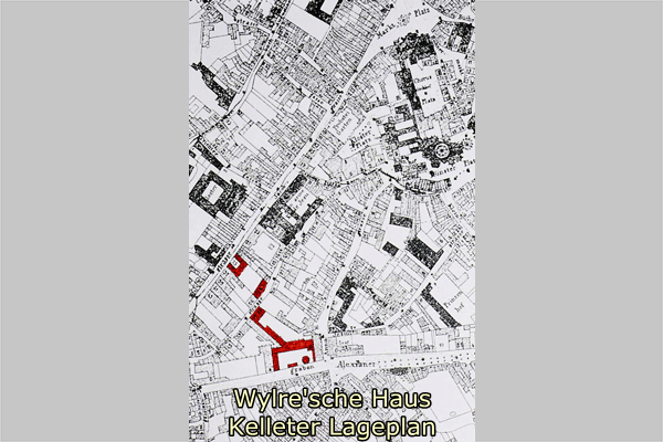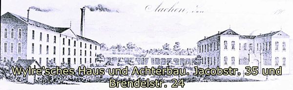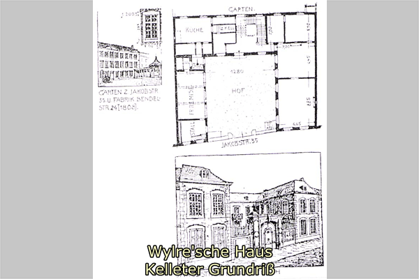 Wylre'sches Haus rechts und der Achterbau von 1808 links. Zwischen den beiden Bauten erstreckt sich ein Garten mit Verbindungsgang und Pavillon. 1808 errichtete Kelleter im Garten des Hauses einen "Achterbau" zur Tuchfabrikation. Das mit einer Traufseite zur Bendelstr. ausgerichtete Gebäude war dreigeschossig mit Satteldach. Die wohl als Hauptfassade ausgebildete Gartenfront war mit einem übergiebelten, dreiachsigen Risalit gegliedert. Im Giebelfeld des Risalits waren Merkur und Ceres dargestellt. Zwischen dem Vorderhaus an der Jacobstr. und dem Achterbau vermittelte ein mit toskanischen Säulen geschmückter Verbindungsgang, der mittig durch einen Pavillion auf rundem Grundriß unterbrochen wurde. Der Achterbau wurde im Zweiten Weltkrieg wohl vollständig zerstört. Der Verbindungsgang ist erhalten.