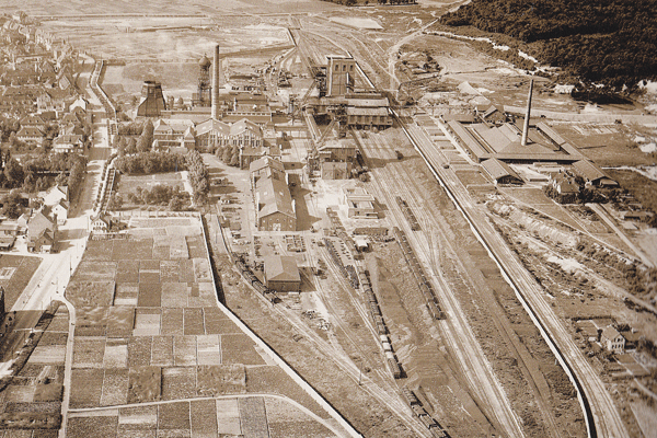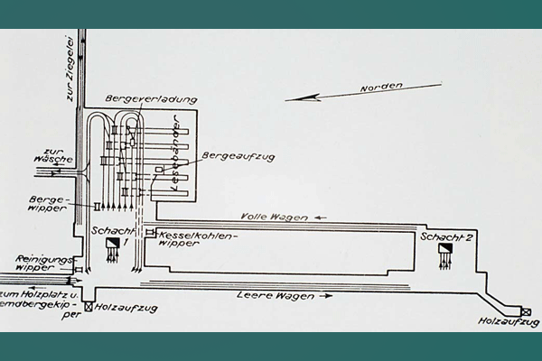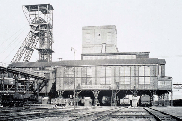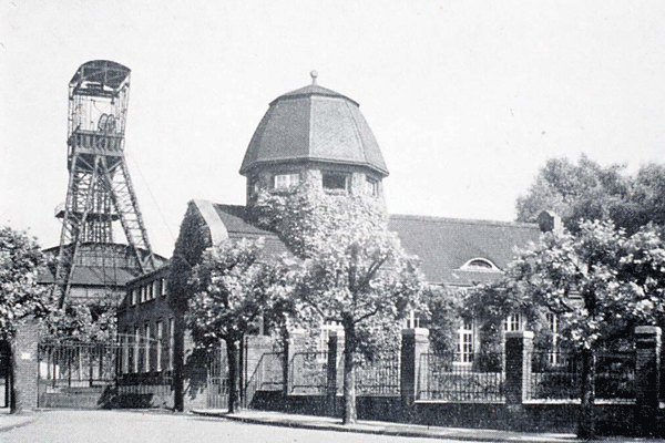 1906 begannen die vorbereitenden Arbeiten zum Abteufen der Schächte im Gefrierverfahren, 1909 war der eigentliche Abteufbeginn und 1910 wurde die Steinkohle bei 477 m (Schacht 1, d= 6,3 m) und 481 m (Schacht 2) erreicht. Für Schacht 1 waren 1913 die Teufarbeiten bei 771 m und Schacht 2 bei 666 m abgeschlossen. 1914 wurde die regelmäßige Förderung aufgenommen. In den Jahren 1906-15 entstanden im wesentlichen die Übertageanlagen der ersten Entwicklungsphase des Bergwerks. Alle Bauanträge und Zeichnungen zwischen 1906 und 1918 waren unterzeichnet von dem Bergwerksdirektor Arthur Jacob und für die Bauausführung von Hesse.