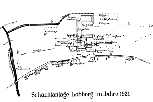 1926 wurde Schacht 1 bis zur 4. Sohle (= 852 m) und 1929-31 Schacht 2 bis zur 3. Sohle (=734m) abgeteuft. Lohberg erreichte 1939 den Leistungsstand einer Großschachtanlage mit einer Jahresförderung von knapp 1,3 Mio t.