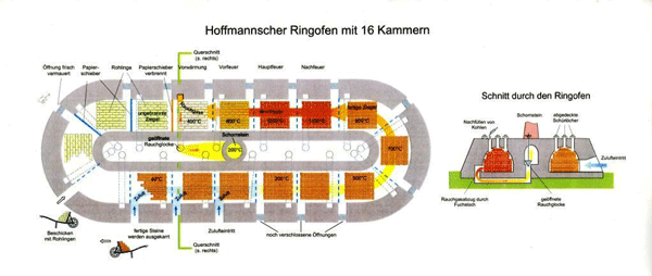 Der bereits 1859 von Hoffmann- und Licht entwickelte Ringofen setzte sich im Düsseldorfer Raum erst zu Beginn der 1890er Jahre langsam durch. Hierbei handelt es sich um einen gemauerten, ovalen Kammerofen. Der Brennkanal ist ein in sich geschlossenes Gewölbe, das durch sogenannte Schieber in verschiedene Kammern unterteilt ist. Das Feuer, durch Kohlengrus unterhalten, wandert durch Belüftung gesteuert durch alle Kammern. In einem solchen Ringofen konnten die Rohlinge kontinuierlich gebrannt werden. Ohne Abbruch des Brennvorganges wurden Rohlinge eingesetzt und die fertigen Ziegel entnommen. Im Schnitt konnten in einem viertägigen Brenndurchgang 250.000 Ziegel gebrannt werden Das neue Befeuerungsverfahren führte zudem zu einer Brennstoffersparnis von 75 Prozent und die Ausschussquote fiel auf ein Prozent. In Zusammenhang mit der Einführung mechanischer Pressen war somit die Grundlage zur industriellen Massenproduktion gegeben. Konnte ein Handziegler bis zu 200 Ziegel pro Stunde formen, schaffte eine Dampfziegelpresse 3500.