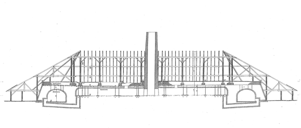 Ringofen Sassen. Schnitt, in der Mitte die Ventilglocke. Quelle: Architektur & Denkmalpflege Ilsetraut Popke, Köln
