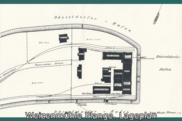 Der 1890-1996 auf der Lausward entstandene neue Düsseldorfer Hafen war äußerst erfolgreich und entwickelte sich zum größten Binnenhafen am Rhein zwischen Mannheim/Ludwigshafen und der Ruhr. Schon 1899 waren alle Plätze an den Hafenbecken verpachtet, so dass 1904- 1907 ein neues Becken entstand. Neben GEG, Döllken & Cie, Bütefuhr & Söhne, Hüllstrang & Cie siedelte sich an diesem Becken in dominanter Lage am Ende der von zwei Becken begrenzten Landzunge die Weizenmühle Georg Plange an. Zehn Jahre nach der Hamburger Gründung entstand also in Düsseldorf 1906 die zweite Dampfmühle des Unternehmens. Das Düsseldorfer Zweigwerk war für 120 Beschäftigte geplant (Hamburg: 180-190) und produzierte mit 38 Weizenstühlen ausschließlich Weizenmehl. Der Antrieb erfolgte durch eine 1200 PS starke Dampfmaschine, die zugleich auch Strom zur Beleuchtung der Produktionseinrichtungen erzeugte. Der Entwurf für die Bauten der Mühle lieferten die Hamburger Architekten Raabe und Wöhleke. Das 1908 erstellte Direktorenwohnhaus (nicht erhalten) entwarf der Architekt Hermann vom Endt aus Düsseldorf. Die Weizenmühle Plange stärkte den Charakter des Düsseldorfer Hafens, der weniger der industriellen Produktion der Stadt, sondern mehr zur Versorgung der Stadt und ihres Hinterlandes mit Nahrungsmitteln, Baumaterialien etc. diente. Besonders markant im Komplex der Weizenmühle Plange war ein zur Hafeneinfahrt ausgerichteter Turmbau, der, von einem Bronzeadler bekrönt und mit einer Lampe versehen Wahrzeichencharakter mit Orientierungsfunktion hatte. Selbst, im Zweiten Weltkrieg durfte trotz strenger Verdunklungsanordnung die Lampe bis zwei Stunden vor jedem Luftangriff brennen.