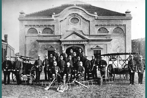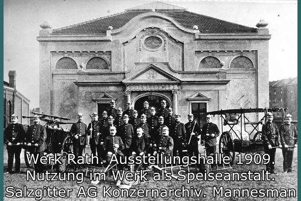 Werksfeuerwehr posiert vor der Ausstellungshalle um 1912. Quelle: Salzgitter AG - Konzernarchiv/ Mannesmann-Archiv in Mühlheim an der Ruhr