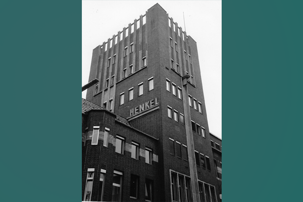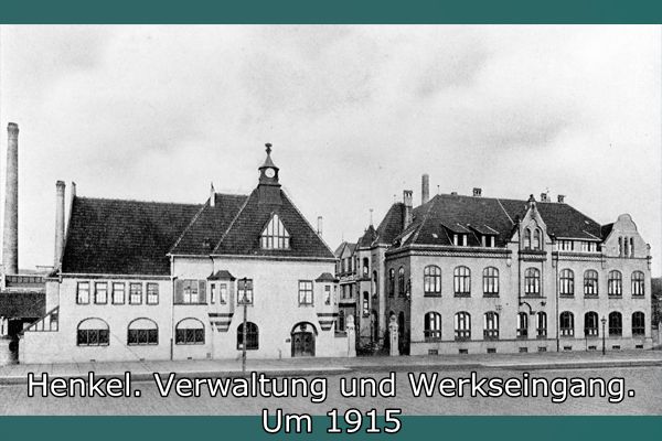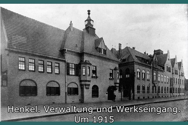 Das erste Verwaltungsgebäude von 1899, nach Entwurf des Architekten Genschmer, war ein bescheidener Putzbau direkt in die Flucht der Henkelstraße. Im rückwärtigen Bereich gab es einen Park, der in den folgenden Jahrzehnten schrittweise überbaut wurde. Der Anfangsbau dürfte in der Substanz noch in den vier ersten, an den Turmbau östlich anschließenden Fensterachsen hinter der Verblendung von 1929 vorhanden sein.