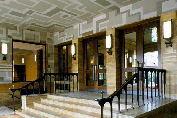 Die an den Turm anschließende viergeschossige Fassade wird ebenfalls durch Naturstein elemente gegliedert. Das oberste Geschoß ist über einem kräftigen Traufgesims mit Konsolfries zurückliegend angeordnet. Der hohe, bis an die Erdgeschoßfenster heranreichende Sockel ist mit Natursteinplatten verblendet und schließt ab mit einem stark dimensionierten Sohlbankgesims. Die segmentbogigen Fenster im Erd- und Obergeschoß ergaben sich in Form und Größe aus den Vorgängerbauten. Die Erdgeschoßfenster sind durch schlanke, stilisierte Schlußsteine betont. Über den Obergeschoßfenstern sind die Verblendsteine in 45 Diagonalen gemauert. Die schlanken Fenster im 2. Obergeschoß sind einbezogen in ein horizontales Streifenwerk aus Natursteinbändern.Die langgestreckte Fassade wird nur unterbrochen durch den aus dem Vorgängerbau von 1913 stammenden Erker und in der Mittelzone durch eine größere Fensterfläche im Obergeschoß zur Belichtung der ehemaligen Speisesäle.