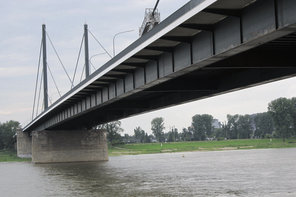 Die Brücke überspannt den Rhein und die direkt anschließende rechtsrheinische Partie in drei Öffnungen mit 108, 260 und 108 Metern Spannweiten. Hauptelemente sind die End- und Mittellager, Pylone, Seile und der Brückenbalken als Unterbau für die Fahrbahnen.