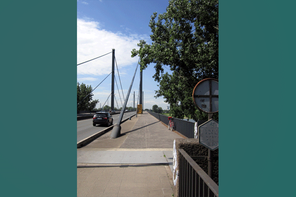 Die Brücke gliedert sich in drei Teile: rechtsrheinische Hochstraße mit Rampenbauwerk, Strombrücke und linksrheinische Flutbrücke mit Deichstraßenbrücke bis zum anschließenden Fahrdamm. Maßgeblich für das Gesamtbild der Brücke und für das Panoramabild der Stadt ist die eigentliche Stromquerung mit der dominanten Schrägseilkonstruktion.