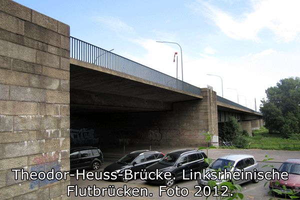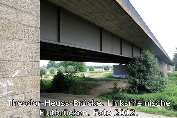 Die Flutbrücke überspannt als durchlaufender Balken die linksrheinischen Wiesen mit sechs Öffnungen von je 72 Meter Spannweite und einer Gesamtlänge von 432 Meter. Aus wirtschaftlichen Gründen wurde ein Verbundquerschnitt gewählt, bei der die Fahrbahnplatte aus vorgespanntem Beton zugleich der Obergurt für die darunter liegenden vier Hauptträger ist. Die in Längsrichtung gespannten Hauptträger sind untereinander mit Querverbänden in Fachwerkkonstruktion verbunden. Der Pfeiler an der Deichstraße ist als Endwiderlager ausgebildet. Die Deichstraße wird mit einer schlanken Stahlbetonbalkenbrücke überspannt.