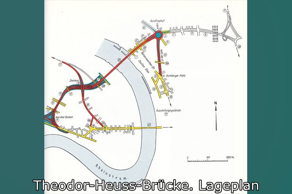 Der Wiederaufbau vieler Rheinstädte nach dem Zweiten Weltkrieg hing stark mit der Reparatur oder dem Neubau von Brücken über diese mächtigste Wasserstraße Europas zusammen. In Düsseldorf war 1950/51 die Südbrücke für 12 Millionen DM wieder erneuert worden. Im gleichen Jahr legte die Bauverwaltung basierend auf Zählungen, Untersuchungen und Prognosen die Denkschrift „Brücken für Düsseldorf“ dem Rat und der Öffentlichkeit vor. Der Bau einer Nordbrücke, der späteren Theodor-Heuss-Brücke sowie der Rheinknie-Brücke war in dieser Denkschrift klar angesprochen. Beide Brücken sollten die zentralen Stadtbezirke von Düsseldorf „umarmen“ und die Stadt wieder stärker mit dem Fluss verbinden. Die städtische Bauverwaltung bevorzugte als Erstbauwerk die Rheinkniebrücke. Das Land setzte sich jedoch mit der Forderung durch, zuerst mit der Nordbrücke zu beginnen, da diese Brücke auch dem Fernverkehr diene. 1952 erfolgte dann der Grundsatzbeschluß im Rat zum Bau der Nordbrücke. Erst 1958 wurde der Neubau der Oberkassler Rheinbrücke beschlossen (Ausführung 1971-76), nachdem zuvor schon die Rheinkniebrücke entstanden war (1965-69). Damit war ein Brückenbauprogramm vollendet mit Brücken auf Sichtweite nach dem stets gleichartigen Prinzip der Schrägseilkonstruktion aber mit interessanten Abweichungen in Bauweise und Detail. Die Nord- oder Theodor-Heuss-Brücke war das Pionierbauwerk dieser eindrucksvollen Brückenfamilie. Hier wurden die technischen und ästhetischen Grundlagen entwickelt.