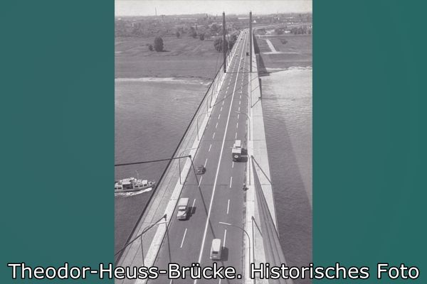 Die Theodor-Heuss-Brücke ist bedeutend für die Geschichte des Menschen. Schon immer waren Brücken und insbesondere Großbrücken über die breiten Ströme in aller Welt Ausgangspunkt für Innovationen in der Bautechnik, Innovationen, die generell in der Architektur und im Bauingenieurwesen grundlegende Bedeutung hatten. Bei der Theodor-Heuss-Brücke sind besonders zwei Aspekte der Konstruktion hervorzuheben: das Schrägseilsystem und die Ausbildung des Brückenbalkens als orthotrope Platte.