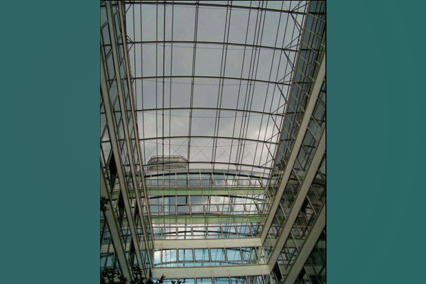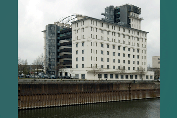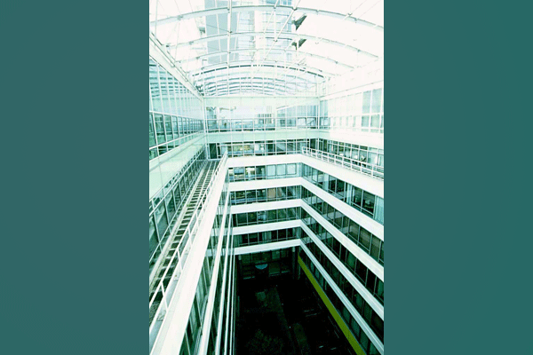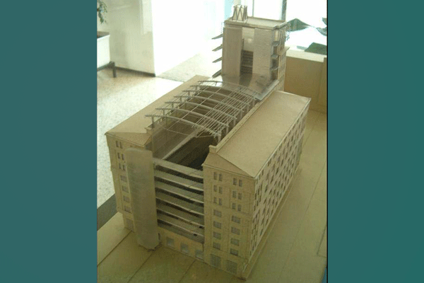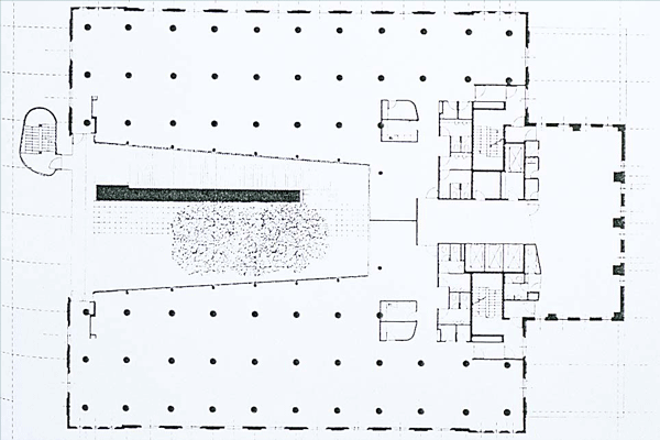 lm Kontorhaus sind die alte Geometrie der Konstruktion und die Fassadenaufteilung beibehalten worden. Die wichtigste Änderung wurde durch die Entkernung entlang der Hauptachse des Gebäudes vorgenommen, die beiden Dachflächen sind quer durchschnitten und bilden so einen Freiraum, der von einem Glasdach überdacht ist. Der Eingriff ist deutlich erkennbar, da für ihn neue Techniken und Materialen verwendet wurden die nichts mit dem alten Charakter des Gebäudes gemein haben. Ein großes außenliegendes Volumen, dessen Form auf die antiken Silos zurückzuführen ist, bildet einen Bruch in der Symmetrie und enthält eine Treppe zur vertikalen Erschließung, die vielleicht im Bestand nicht möglich gewesen wären.