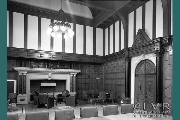 Im Inneren ist die Gestaltung der Eingangshalle mit massiver Haupttreppe sowie ornamental, figürlich mit Tierdarstellungen und floral verzierten, schmiedeisernen Brüstungsgittern erhalten. Wie in der Eingangshalle befinden sich auch in anderen Flurbereichen noch die Fußboden- und Wandfliesen aus der Bauzeit. Der hohe Gewerkensaal mit offenem Dachstuhl lehnt sich mit seiner Holzausstattung und einem großen Kamin an Formen der deutschen Renaissance an.
