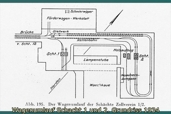 Ausstattung: Auf Hängebankebene führen auf den Schacht zwei Gleise auf der Aufschiebeseite mit Brems- und Aufstoßvorrichtungen zu. Ein Gleis verzweigt sich über eine Weiche kurz vor dem Schacht. Es wird seitlich am Schacht mit Bremsvorrichtung vorbeigeführt. Die beiden aus dem Schacht herausführenden Gleise und das Seitengleis vereinigen sich an der Abzugsseite zu einem zur Kettenbahn des Wagenumlauf von Schachtes 1 führenden Gleis. (Walter Buschmann)