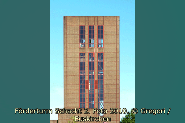 Der Turm wird umhüllt von einer einheitlich gestalteten Stahlfachwerkfassade, die die unterschiedlichen Funktionsbereiche des Turmes nicht widerspiegelt, sondern formal mit den dominierenden Horizontalgefachen auf den anschließenden Wagenumlauf bezogen ist. Der Turm wird an den Schmalseiten von jeweils einem und an den Längsseiten von jeweils drei vertikalen Fensterbändern belichtet. Die Fensterbänder sind im Bereich der Maschinenbühne durch geschlossene Gefache unterbrochen, so dass zumindest der Turmkopf als eigenständiger Funktionsbereich mit Fördermaschine im äußeren Erscheinungsbild ablesbar wird. Die schmaleren Gefachbreiten der Fensterbänder korrespondieren mit den Eckgefachen.