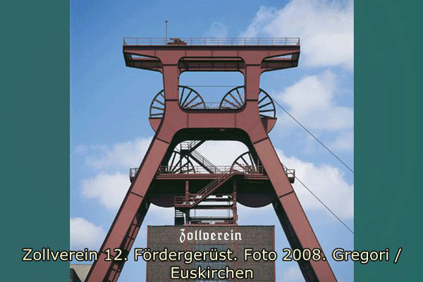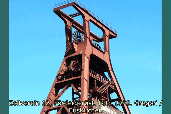 Die vier Strebenfüße sind über Gelenke auf vier Einzelfundamenten aufgelagert. Zwischen den Streben ist zur Aussteifung K-Fachwerk aus Vollwandprofilen eingefügt. Die von den Fußpunkten aus in den Flanschstärken stetig zunehmenden Streben laufen bis zur oberen Seilscheibenbühne durch und gehen dort über biegesteife Eckausbildungen in die stark dimensionierten oberen Seilscheibenträger über. Die ebenfalls kräftig bemessene Konstruktion der Kranbahn setzt an diesen Eckverbindungen an. Die untere Seilscheibenbühne ist zwischen den Strebenbeinen eingefügt und wird dadurch optisch in den Hintergrund gerückt. Die vier Seilscheiben haben Durchmesser von 6,5 m. Das Führungsgerüst setzt Unterhalb der unteren Seilscheibenbühne an und wird fast vollständig von der Schachthalle umhüllt. Auf der oberen Hängebankbühne sind noch die vier Schachttore aus der Zeit der Gestellförderung erhalten.