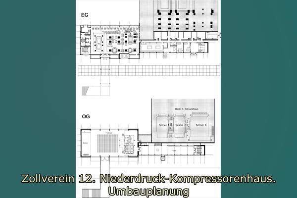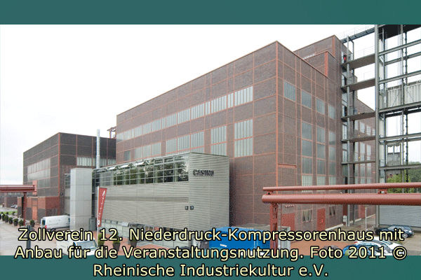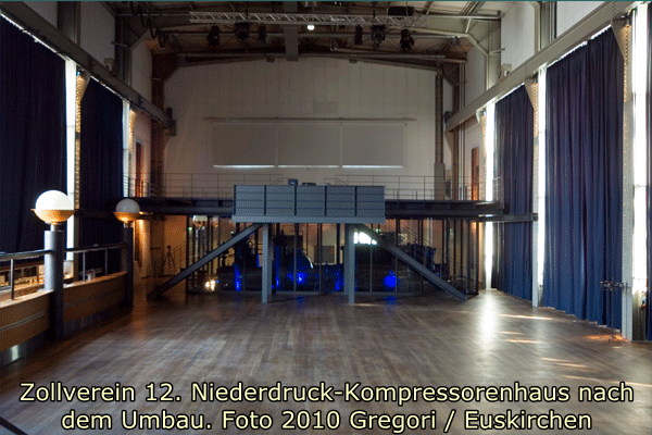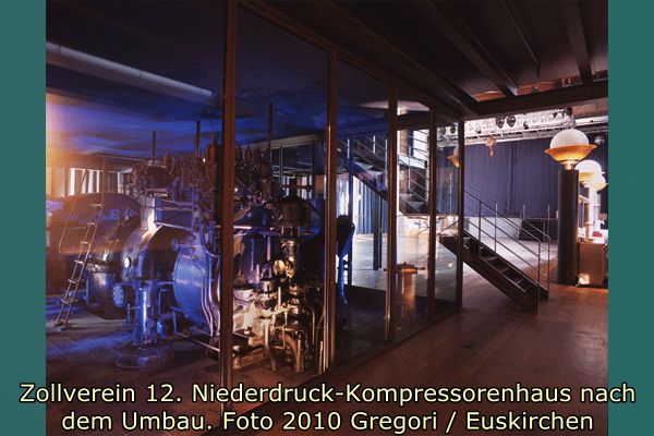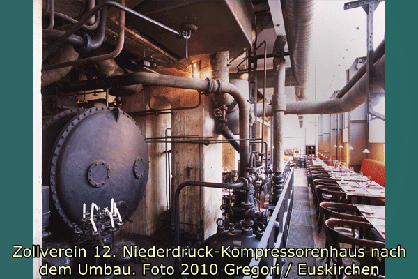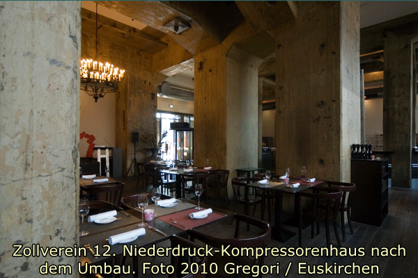Das Gebäude wurde 1995/95 für ein Restaurant und im Obergeschoss für eine Veranstaltungshalle umgebaut. Der Niederdruckkompressor konnte dabei erhalten werden und ist nun mit Glaswänden eingehaust in der Veranstaltungshalle zu sehen. Auch im Restaurant sind Ausstattungsteile und originale Wandflächen erhalten worden. Für die Restaurantküche und Garderobe wurde ein Anbau mit Stahlblechfassaden errichtet. Als Zugang zum Veranstaltungssaal entstand eine Außentreppe in Stahlkonstruktion mit Gangway. (Walter Buschmann)