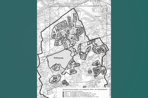 Jenseits der bescheidenen Ortszentren wurde das Ortsbild besonders durch ausgedehnte Siedlungen der Zeche Zollverein bestimmt. Zollverein zählte zu den so genannten Polenzechen mit einem starken Anteil polnischsprechender Bergleute an der Gesamtbelegschaft. Die ersten Siedlungshäuser entstanden seit 1860. Ein Höhepunkt der Bautätigkeit in den Siedlungen waren die Jahre zwischen 1890 und 1914. Zu den Siedlungen mit herausragendem Überlieferungszustand aus jener Zeit zählen die Anlagen Hegemannshof I(Meerbruchstraße) und Colonie III(Schlägel- und Eisenstraße).