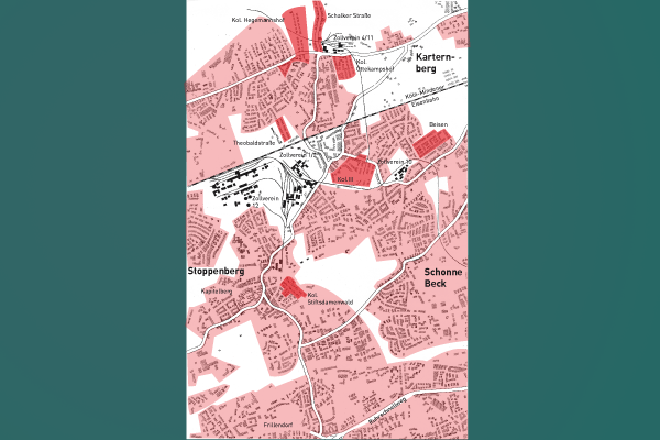 Bis 1900 war die Zahl der Einwohner auf 32.401 gestiegen mit einer eindrucksvollen, nur auf den Bergbau bezogener Monostruktur. Mit der Stoppenberger Mitte und dem Katernberger Markt entstanden zwei städtebauliche Zentren mit einer bescheidenen Urbanität von kleinstädtischem Zuschnitt. Während in Stoppenberg an einem Platz das mehrfach erweiterte Rathaus 1876 erbaut wurde, wurde der Katernberger Markt mit zweitem Amtshaus für Polizei und Amtsgericht, Post, evangelischer Kirche ausgestattet und entwickelte sich mit zwei- bis dreigeschossigen Wohn- Geschäftshäusern an den auf den Platz zuführenden Straßen zu einem Zentrum des um 1900 etwa 10.000 Einwohner zählenden Ortes.
