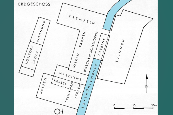 Zweifelsfrei war auch, dass eine gewisse Erläuterung der Fabrikräume sinnvoll und notwendig war, weil die Besucher sich sonst hilf- und orientierungslos dem Fabrikkosmos gegenüber fühlen würden. Eine Ergänzung ist auch notwendig, weil zentrale Bestandteile des historischen Betriebslebens nicht mehr sichtbar sind: der Akkordstress, das Betriebsklima, die Farbbrühe, die direkt in den Bach abgeleitet wurde. Knappe Tafeln erläutern daher kursorisch die Nutzung der einzelnen Räume. Auszüge aus Interviews mit ehemaligen Arbeitern zu einzelnen Maschinen und Inventarteilen geben weitere Informationen zum Arbeitsablauf und dem Betriebsleben. Hölzerne Hände mit Werkzeugen und Arbeitsmaterial am Krempelsatz symbolisieren die alltäglich notwendigen Handgriffe und Verrichtungen an diesen Maschinen. Ein Modell der langen Transportwege der gesamten Fabrik, verdeutlicht den Weg, den die Wolle nimmt, bevor sie als Tuch ausgeliefert werden kann.