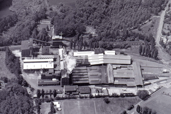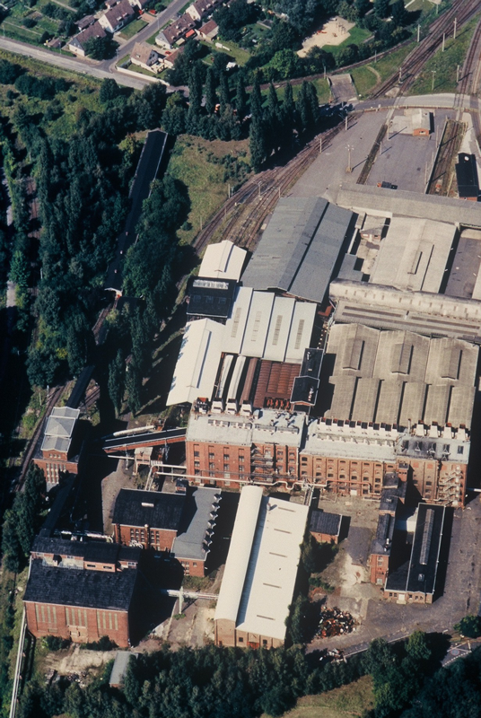 Das Luftbild zeigt die bis heute dominante Wirkung des Trocken- und Pressenhaus als ein quer die Anlage tielenden Gebäuderiegel