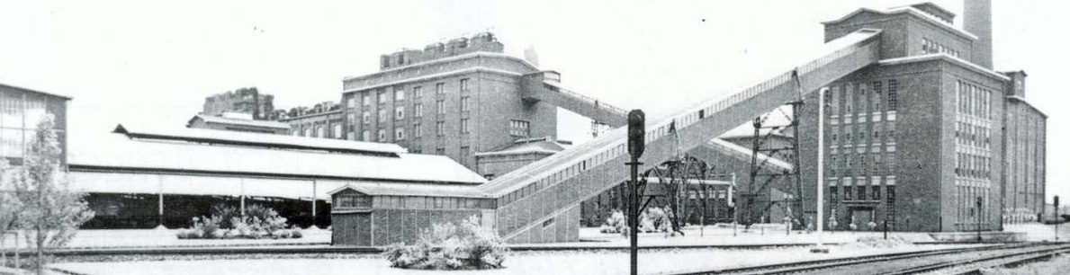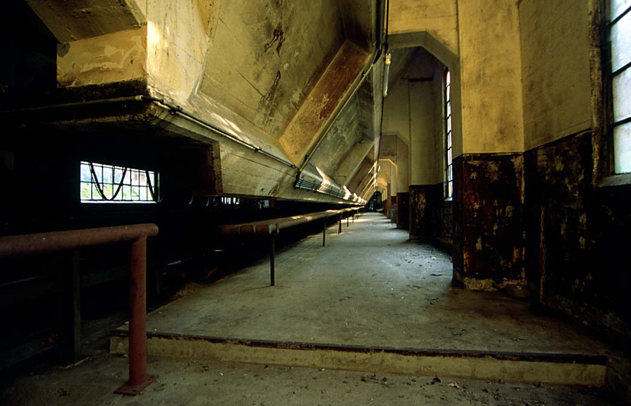 Untergeschoß des Bunkers. Die oben aus den Eisenbahnwaggons eingegebene Kohle kam hier auf das zum Nassdienst führende Förderband.