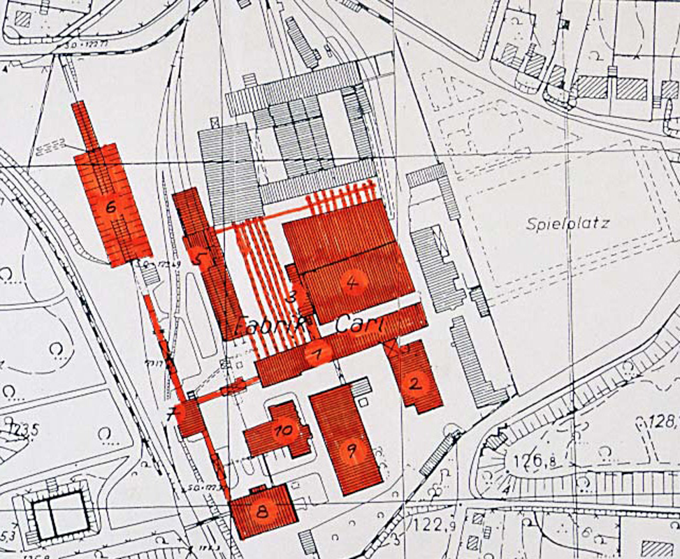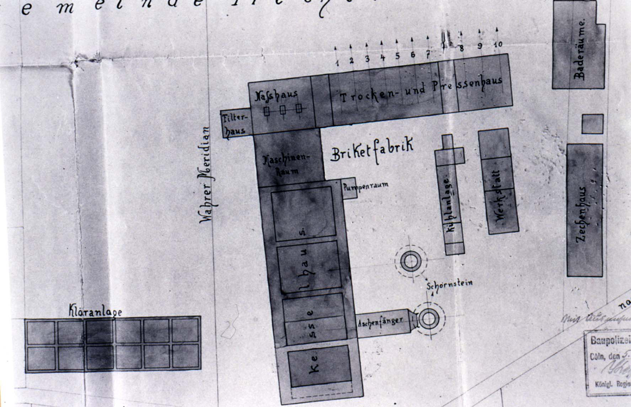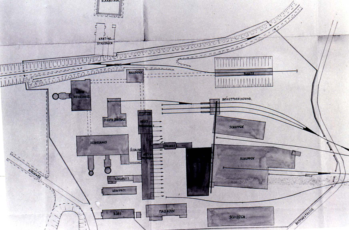 Lageplan der Brikettfabrik Carl von 1930. Die Erweiterungsbauten liegen in der oberen Hälfte des Lageplans.
