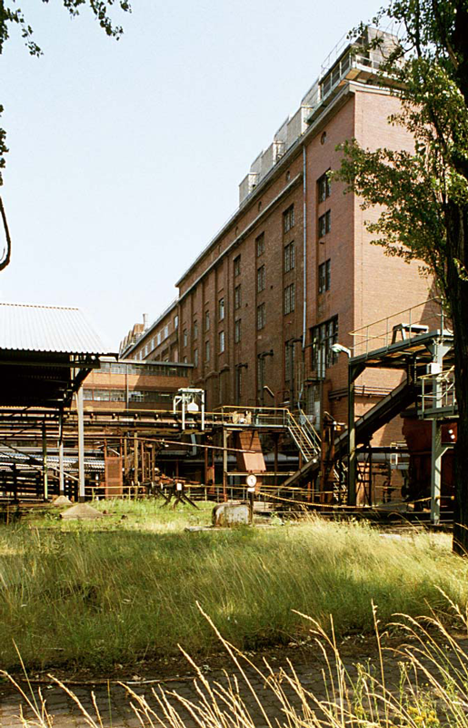 Blick von Osten auf die Fabrik II mit Bunker (links) und Nassdienst im Vordergrund.