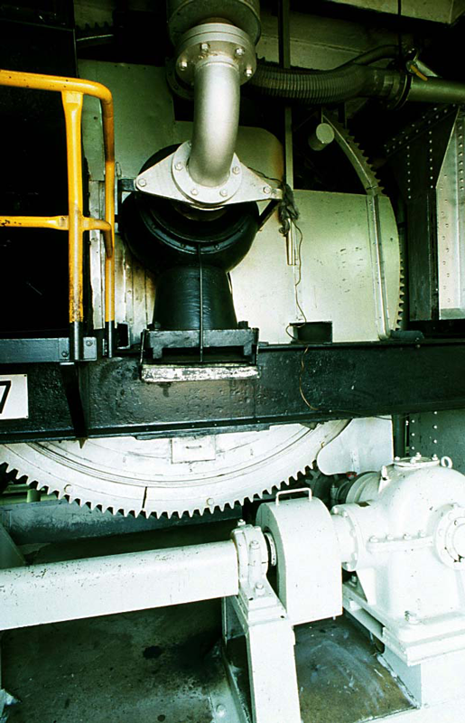 Die Entstaubung der Pressstempel erfolgte über im Boden verlegte Leitungen, welche in die hinter den Pressenrümpfen angebrachten zwei Zyklone münden, aus denen der feine Staub nach oben abgesaugt wird, während der gröbere über Zellenräder mit elektrischem Antrieb zurück in die Speisevorrichtungen fällt. Die Absaugrohre der Speisevorrichtungen münden kurz vor den Zyklonen in denen der Stempelentstaubung. Die Maulentstaubung erfolgte über eine separate Anlage. Die zugehörigen Rohre mit den trichterförmigen Erweiterungen über den Pressenmäulern sind entfernt.