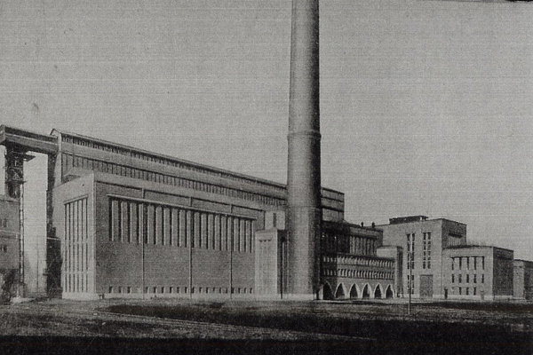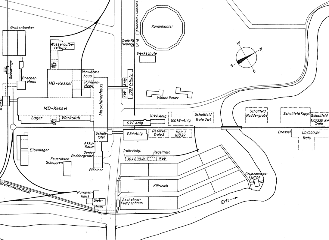 In der T-förmigen Zuordnung von Kessel- und Maschinenhaus blieb Georg Klingenberg seinen seit 1909 realisierten Grundsätzen (Märkisches Elektrizitätswerk Heegermühle bei Eberswalde) treu. Das Kesselhaus lag dabei geradlinig in der Achse der Kettenbahn, so daß die Braunkohle den gewünscht einfachen, geraden Weg von der Gewinnung bis in die Kessel hatte. Quer zur Kesselhausachse lag das Maschinenhaus mit einer zentralen Warte, die dem Maschinenhaus als würfelförmiger Kubus vorgelagert war.
