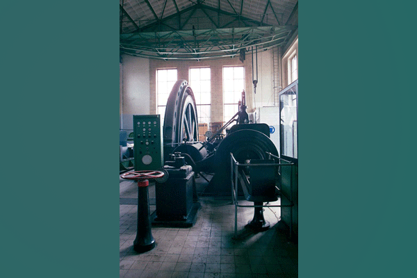 Das 1922|23 errichtete ursprüngliche Gebäude war eine Backsteinhalle auf Rechteckgrundriß mit Satteldach und Belichtungsraupe über dem First. Die Halle war durch eine Querwand unterteilt in Ventilatoren- und Maschinenraum.