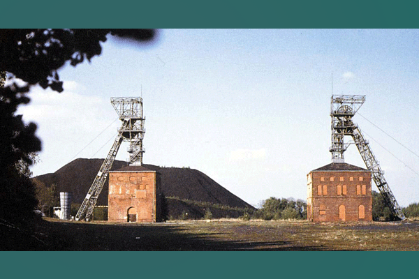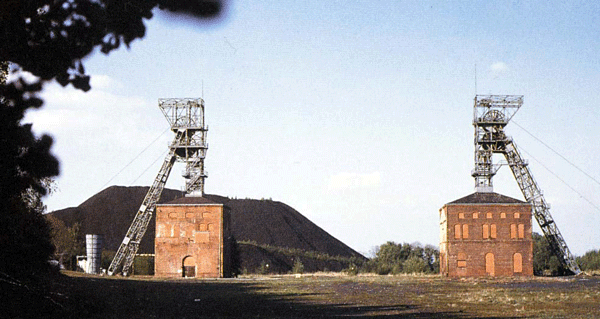 Foerdergerüste mit Schachthallen, links Schacht 2, rechts Schacht 1