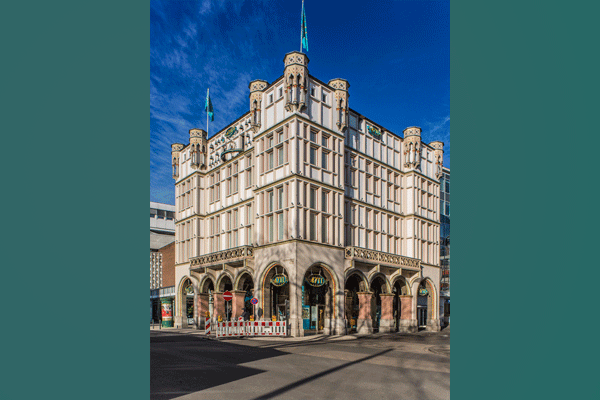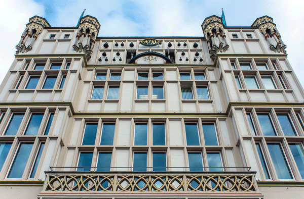 In die Architektur der Dachzone ist ein Glockenspiel mit historischen Figuren, die am Betrachter zu den Klängen der Marseillaise und des Treuen Husaren zu jeder vollen Stunde zwischen 9 und 19 Uhr vorbeiziehen.