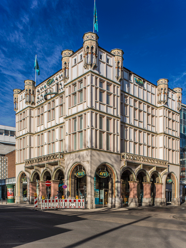 Das Stammhaus an der Glockengasse überlebte das Bombeninferno des Zweiten Weltkriegs nicht. Durch den Bau der Nord-Süd-Fahrt konnte es auch nicht an alter Stelle wiederaufgebaut werden und entstand neu als markantes Eckhaus. Da es zuvor in die Straßenzeile mit Nachbarhäusern rechts und links eingebunden war, mussten die Architekten des Wiederaufbaus Joh. Jacob Claassen und die Brüder Wilhelm und Rudolf Koeb eine Seitenfassade dazu erfinden. Auch die Erdgeschoßöffnung mit Arkaden ist eine Idee der Wiederaufbauzeit. Über den Arkaden erhebt sich eine an Kölner und flämischen Vorbildern orientierte Fassadenarchitektur mit mächtigen Kreuzstockfenstern, Eckwarten und einem wehrgangartigen Wandabschluss im Dachbereich.