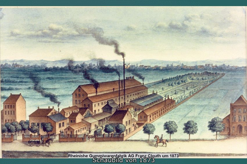 Kautschuk war in Europa nach den Forschungsreisen des Franzosen Charles Marie de la Comdamine durch Äquatorialamerika seit 1745 bekannt. Die Anwendungsmöglichkeiten jedoch waren zunächst begrenzt. In England stellt man unter dem sprechenden Namen Rubber seit 1770 Radiergummi her. Die erste Fabrik für Hosenträger, Strumpfbänder und dergleichen entstand 1803 in Paris. Doch erst die Entdeckung des Amerikaners Goodyear von 1839, mit der Rohgummi durch Erhitzen unter Zugabe von Schwefel zugleich elastisch war und auf Dauer auch blieb, verhalf dem Rohstoff zu seinem großen Erfolg im 19. und 20. Jahrhundert. Nun entstanden auch in Deutschland zahlreiche Gummifabriken, besonders in den 1850er und dann in einer zweiten Gründungswelle in den 1870er Jahren. Zentren der neuen Industriebranche waren Hamburg, Hannover, Thüringen und das Rheinland, wobei in Köln gleich zwei erfolgreiche Unternehmen entstanden. 1843 hatte Ferdinand Kohlstadt zunächst unweit der Eigelstein-Torburg in der nördlichen Altstadt, dann in Nippes und schließlich an der Deutz-Mülheimer-Straße eine Gummifädenfabrik gegründet, die sich noch heute mit eindrucksvollen, denkmalgeschützten Bauten aus der Zeit um 1910 am Nordrand von Deutz präsentiert. Franz Clouth gründete sein Unternehmen 1862 ebenfalls in der Kölner Altstadt, vertrieb wie anfangs Kohlstadt aus England eingeführte Produkte und entwickelte erst mit Verlegung des Betriebes nach Nippes 1868 eine größere eigene Produktion.