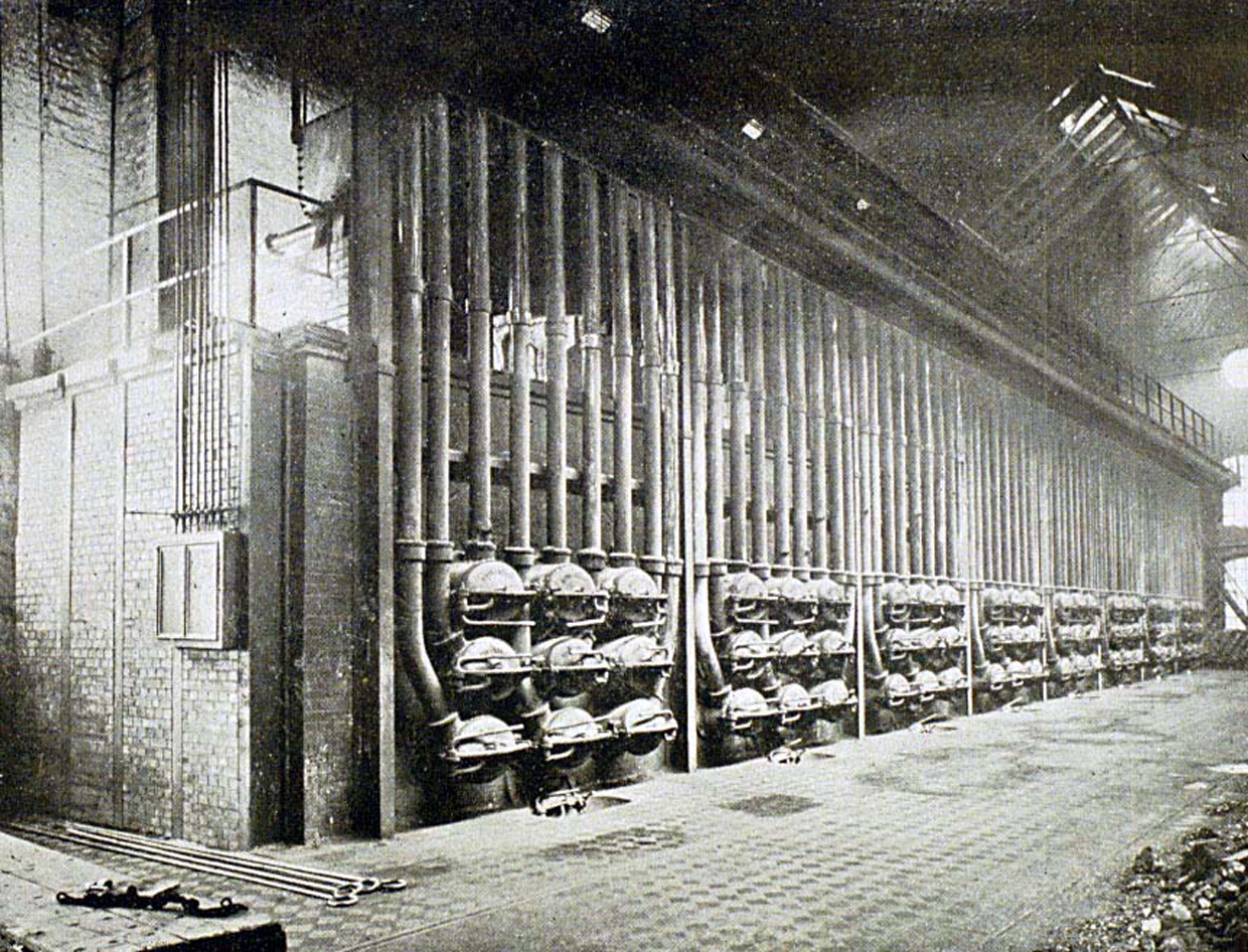 Retorten im Ofenhaus. Durch die geöffneten Rundtüren wurde die Kohle per Handarbeit in die Retorten geschaufelt.