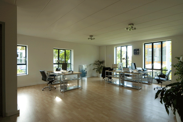 offene Grundrissgestaltung ist der ursprüngliche Raum in seinem Eindruck erhalten. Teilbereiche und ein Besprechungsraum sind durch Glaswände abgetrennt. In