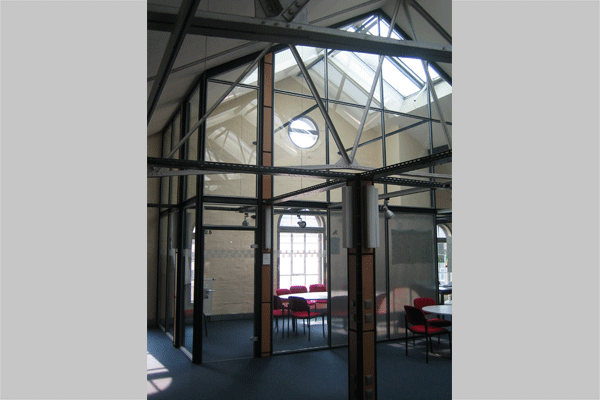 akustischen Gründen eingehaust wurde. Die Stahl-Glas-Konstruktion die hier gewählt wurde ist abgehangen und dadurch sehr schlank in ihren Profilstärken.
