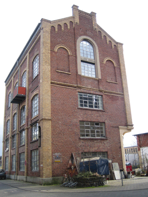 Ende des im übrigen sanierten Geländes der ehemaligen Batteriefabrik hat sich ein wohl um 1910 entstandenes Fabrikgebäude mit Tordurchfahrt erhalten. Das