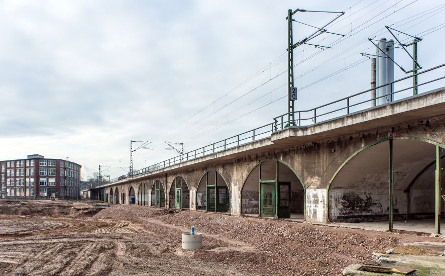 Beschreibung Nach Umbau und Sanierung sind vom Ehrenfeld-Viadukt der Köln-Aachener Eisenbahn 49 Bahnbögen mit dahinter liegenden Tonnengewölben sichtbar erhalten geblieben.