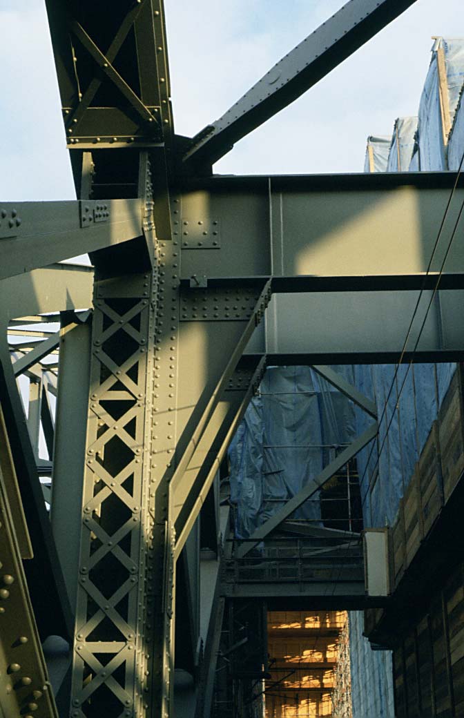 gelangen konnte. Der Gerüstbau an der Hohenzollernbrücke hatte höchsten Stellenwert, denn von seiner Planung und Ausführung hingen die wichtigsten Abläufe ab. Die Durchführung der Stahlbauarbeiten, die Ausführung des Korrosionsschutzes und die Sicherstellung eines reibungslosen Eisenbahn- und Schiffverkehrs mussten gewährleistet sein, sowie das Aufrechterhalten aller eisenbahntechnischen und betrieblichen Funktionen auf der Brücke.