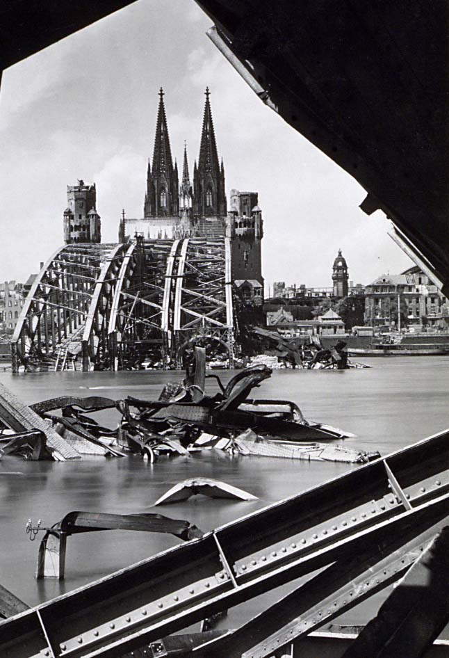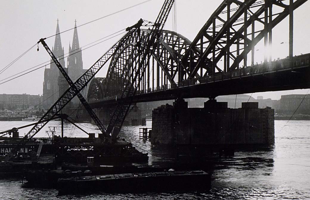 Schon nach dem Krieg wurden Sanierungsarbeiten an der Hohenzollernbrücke durchgeführt, bevor man diese in den 50er Jahren viergleisig wiederherstellte. Die noch vorhandenen Brückenträger wurden aus dem Rhein gehoben und auf ihr Tragverhalten geprüft. Die Brückenbogen wiesen Risse, Einschlag-, Durchschlag- und Durchschusslöcher auf. Bei der Sprengung und dem nachfolgenden Absturz wurden viele Teile auf Verdrehung, Knickung und Biegung beansprucht. Die Firma Krupp, die auch die neuen Bögen fertigte, richtete die Originalbogen so wieder her, dass sie für den Aufbau verwendet werden konnten.