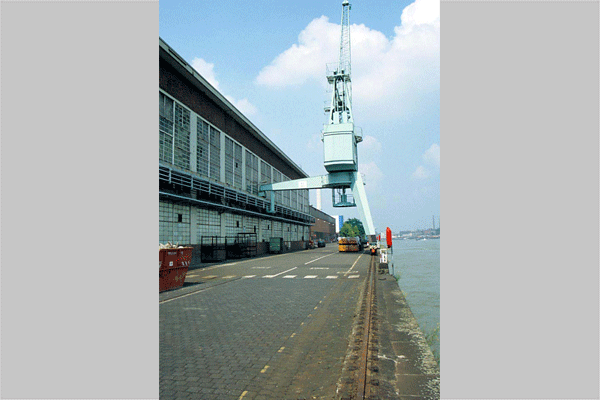 Unterwasserbetonfundamenten errichtet. An der 170 m langen Hallenfront zur Kaimauer befanden sich die Verladekräne.